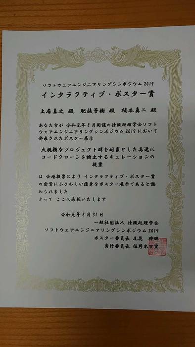 また、土居真之さんは同シンポジウムで、既発表論文である“言語モデルによるソースコードの「自然さ」を利用した自動生成ファイルの特定”を発表しました。