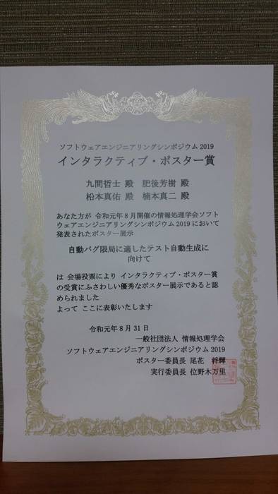 柗本真佑助教は、“kGenProg: 高拡張性・高処理効率性・高可搬性を備えた自動プログラム修正システム”というタイトルで発表しました。